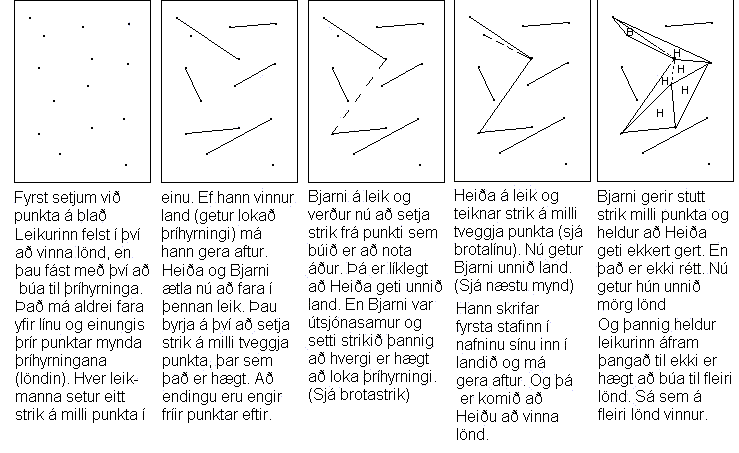 Sá sem byrjar stendur fyrir utan (langa svæðið neðst á parísnum) og kastar steininum í fyrsta gatið. Síðan á hann að hoppa inn í fyrsta gatið og fara allan hringinn (frá 1-6) og síðan út úr parísnum (fyrir neðan gat 6). En……hann á að sparka steininum með sér allan tímann milli gata og má bara vera á öðrum fæti í götum nr. 2 og 5 (sjá mynd). Ef hann kemst allan hringinn kastar hann næst í gat nr. 2 og síðan í 3 og þannig verður leiðin smám saman styttri sem þarf að sparka steininum með sér.