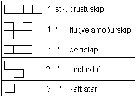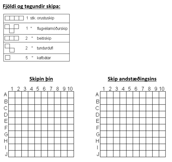 Skipaorusta er tveggja manna spil. Hvor keppandi fær svona blað (sem þú getur prentað út hér). Útlit og fjölda skipa hvors leikmanns má sjá hér á myndinni til hliðar. Byrjið með að teikna eigin skip í aðra töfluna en athugið að þau mega ekki snertast. Hin taflan er svo hægt sé að merkja inn hvar skip andstæðingsins liggja. Markmiðið er að sökkva skipum andstæðingsins. Það gerið þið með því að nefna til skiptis reiti. Ef annar segir t.d. „E-5″ þá skoðar mótspilarinn hvort eitthvað er í þeim reit hjá sér. Ef skip sem hann er með liggur gegnum þann reit segir hann; „Þú hefur laskað ……skip“ (nefnir skipið sem er laskað/skemmt, t.d beitiskip). Spyrjandinn setur þá X í E-5-reitinn hjá sér á tóma borðinu. Ef ekkert er í reitnum sem hann nefnir setur hann punkt í reitinn til að sýna að reiturinn sé tómur. Þannig finnur hann smátt og smátt út hvernig skipið snýr og sekkur því að lokum. Sami keppandi spyr aldrei tvisvar í röð. Setjið punkta umhverfis skip sem hefur verið sökkt svo að þið nefnið ekki þá reiti og munið þá að skip mega aldrei snertast. Góða skemmtun! |