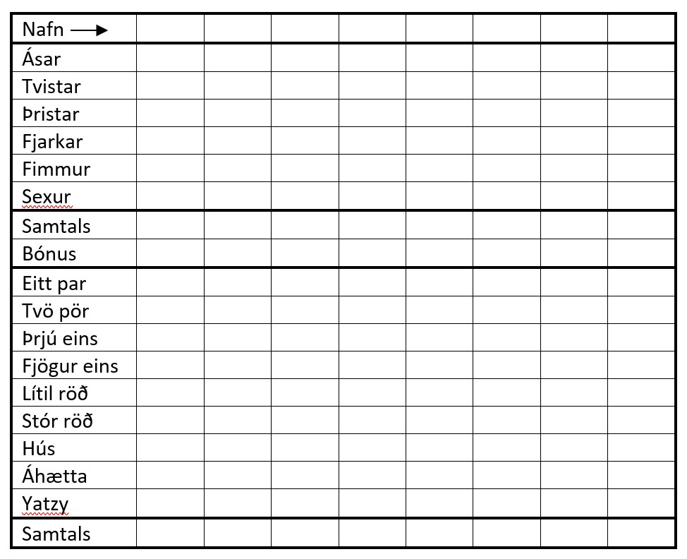 Til þess að leika hann þurfið þið fimm teninga og yatsy-blokk. Þið getið líka teiknað upp þessa töflu á blað eða prentað hana út.