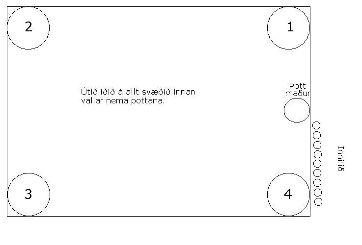 Þátttakendum er skipt í tvö lið. Kastað er upp krónu um það hvort liðið byrji inni.Völlurinn er á stærð við fótboltavoll (á skólalóðum) og eru fjórir pottar teiknaðir í hornin og einn fyrir miðju innilínu. SJÁ MYND